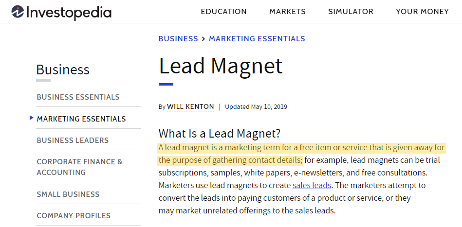 “A lead magnet is a marketing term for a free item or service that is given away for the purpose of gathering contact details.”