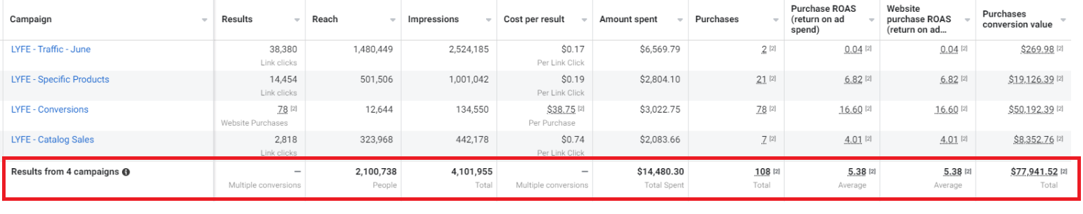 These were the results we achieved for them: 55,652 link clicks at $0.21 cost per click, 108 purchases resulting in $77,941 revenue at a 5.38 ROAS.