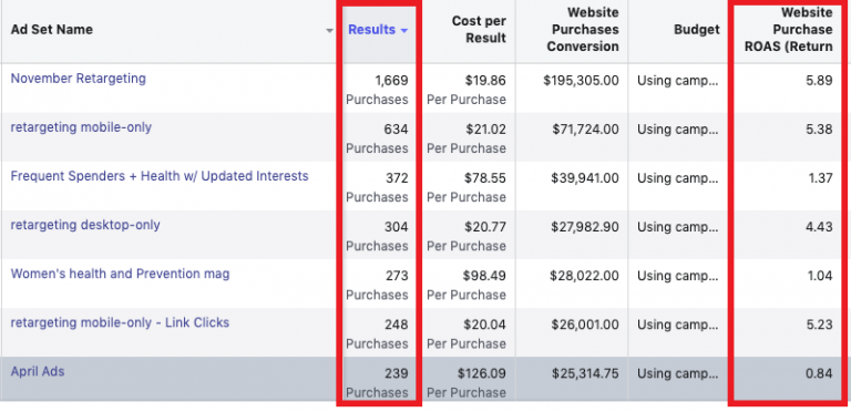 But as you can see, we also A/B split tested many different cold ad sets as well to help them consistently find new customers at an affordable cost.