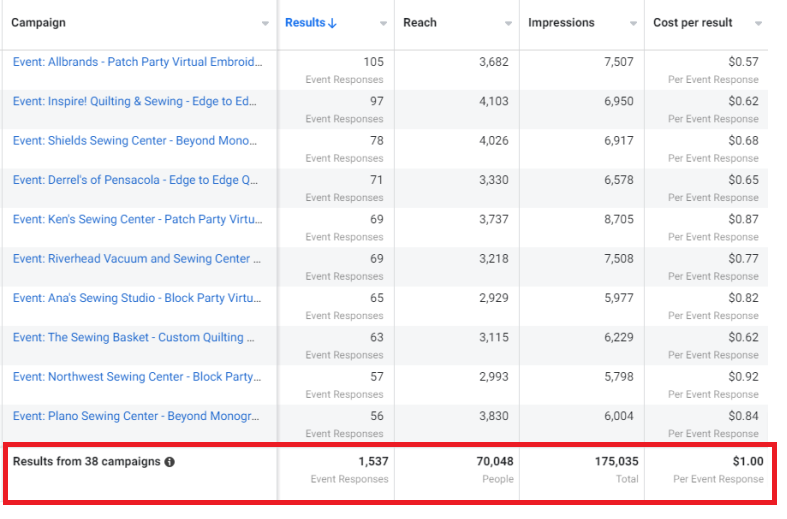 We brought in 1,663 purchases and $21,804 in revenue at a 13.69 ROAS. We also helped them receive 1,537 event responses at $1.00 per event response for their educational events.