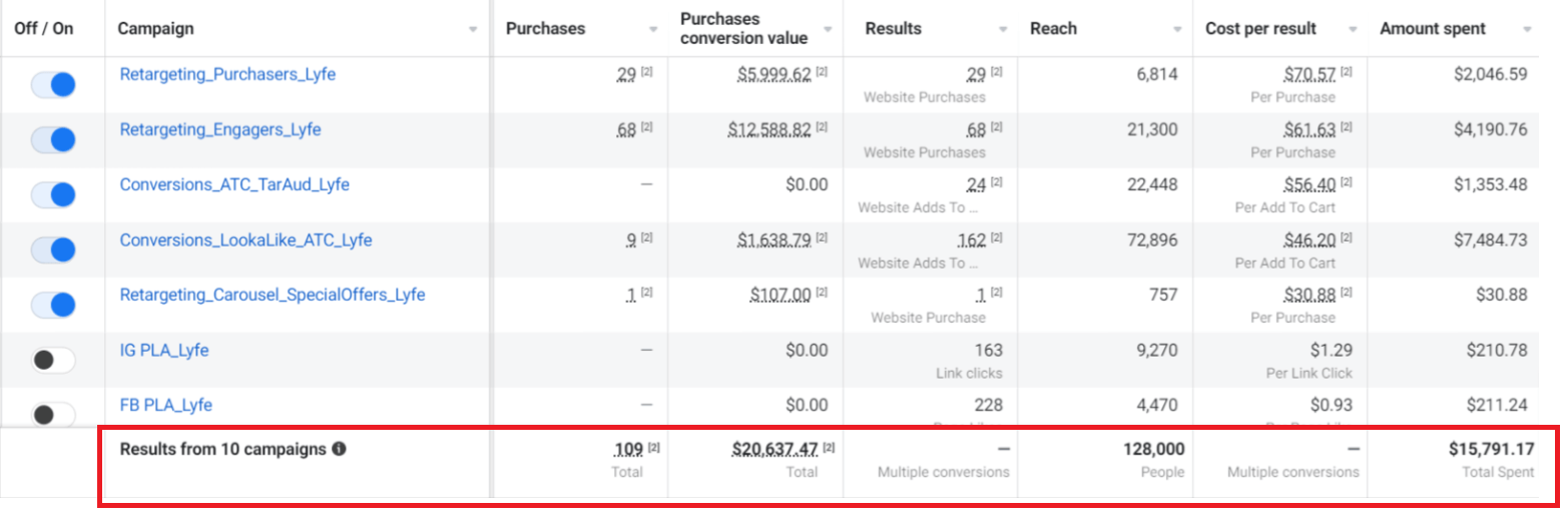 We ran value-based lookalike audiences and focused on bottom-of-funnel campaigns like purchases, add-to carts, and lookalikes.