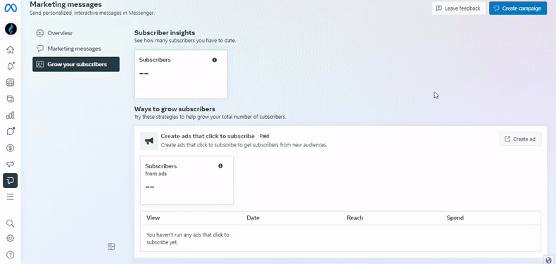Once you click on the Overview screen, this is now the screen you’ll see when you click on your Facebook Marketing Messages.