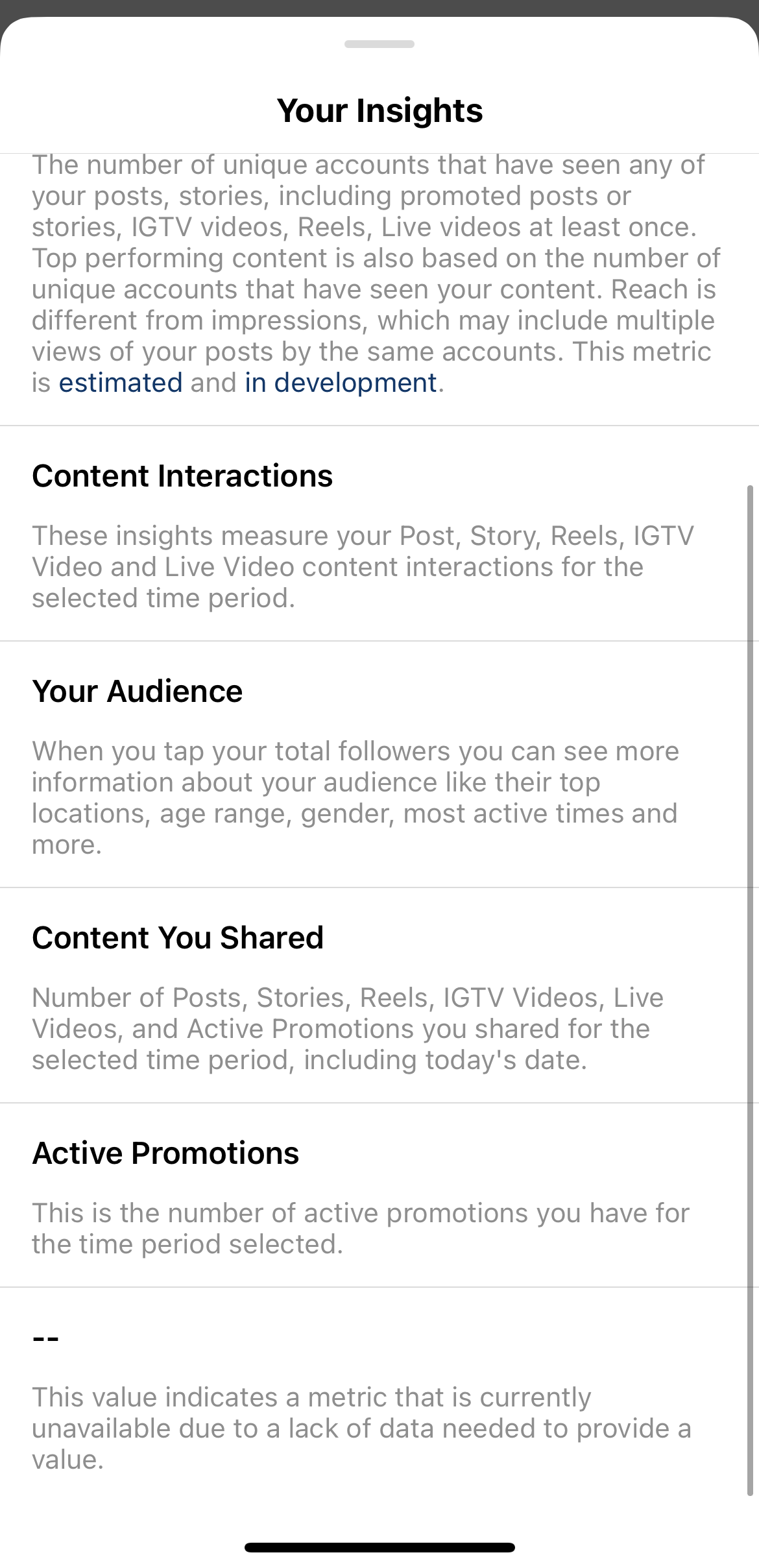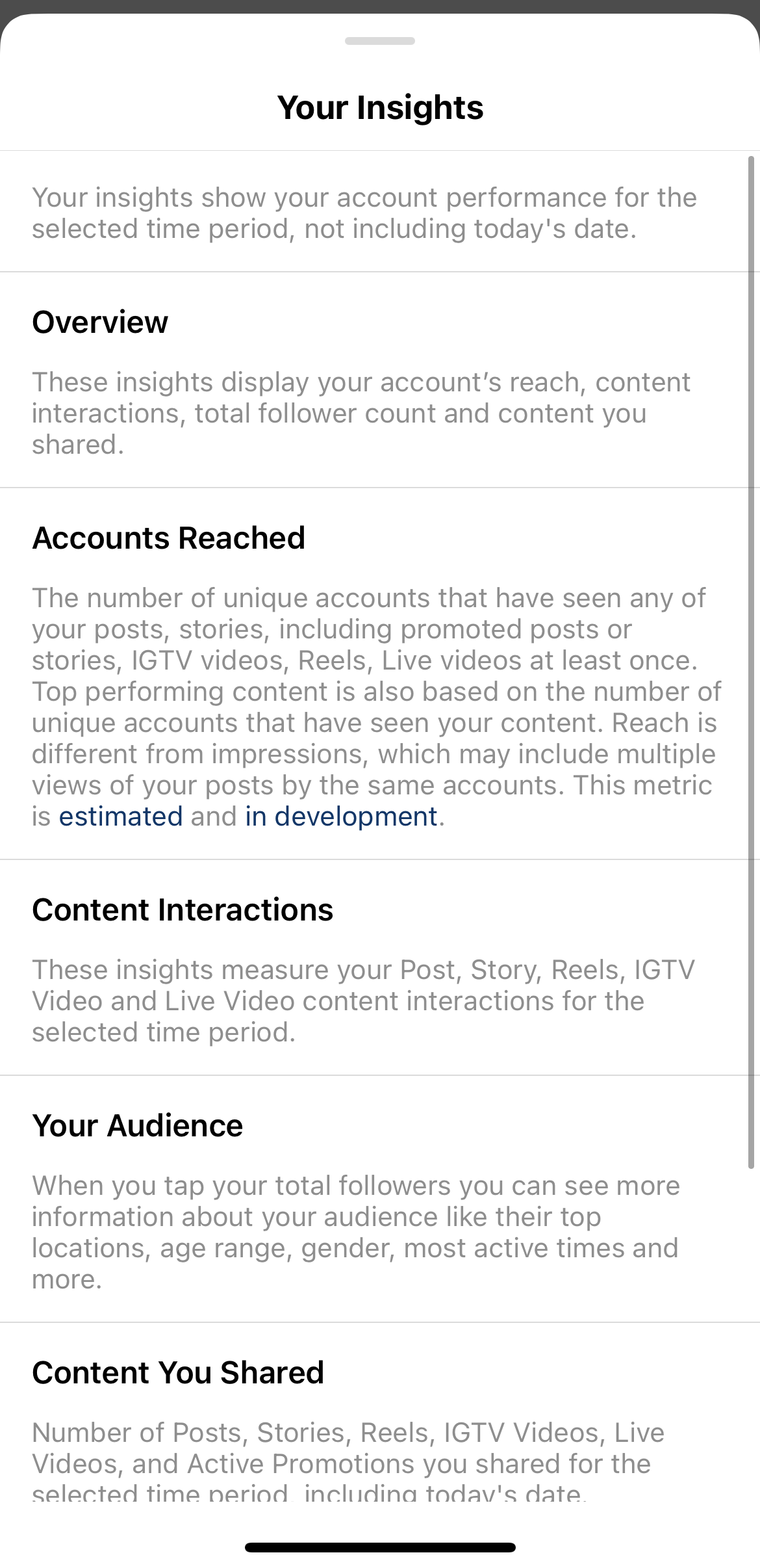 “These insights display your account’s reach, content interactions, total follower count and content you share.”