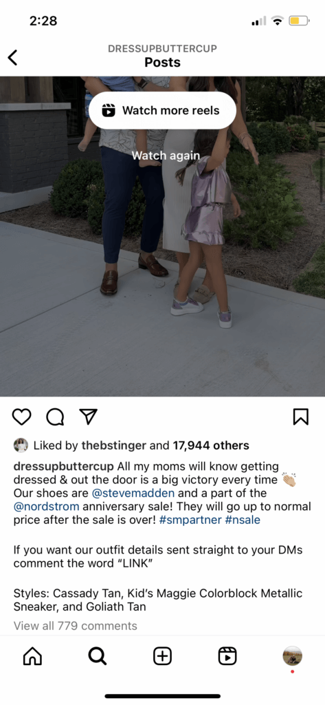 A lot of influencers are doing this, like this one which says, “If you want our outfit details sent straight to your DMs, comment the word LINK.”