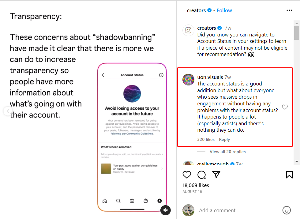 This leads them to believe they’re still being shadowbanned even though their account status is all good.