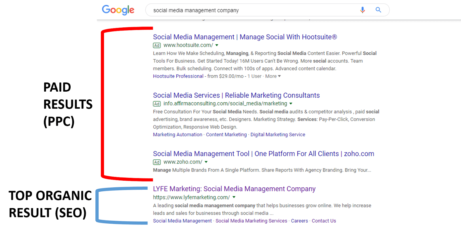 PPC results appear at the top of the search results with an “ad” symbol next to them, whereas the SEO results appear beneath that with no “ad” symbol.