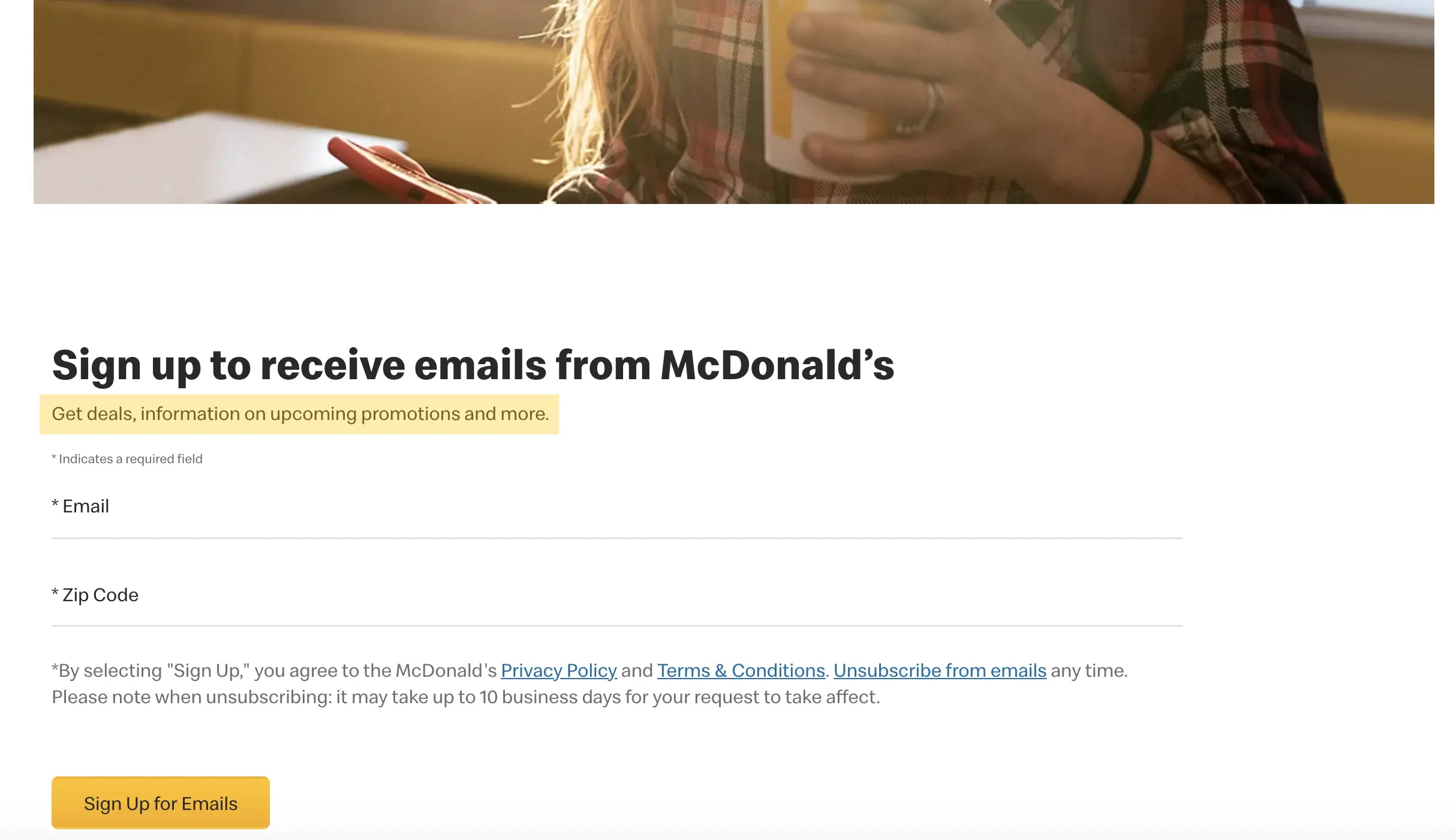 “Sign up for our email newsletter now to receive our chicken parm recipe or a $5 off coupon”.
