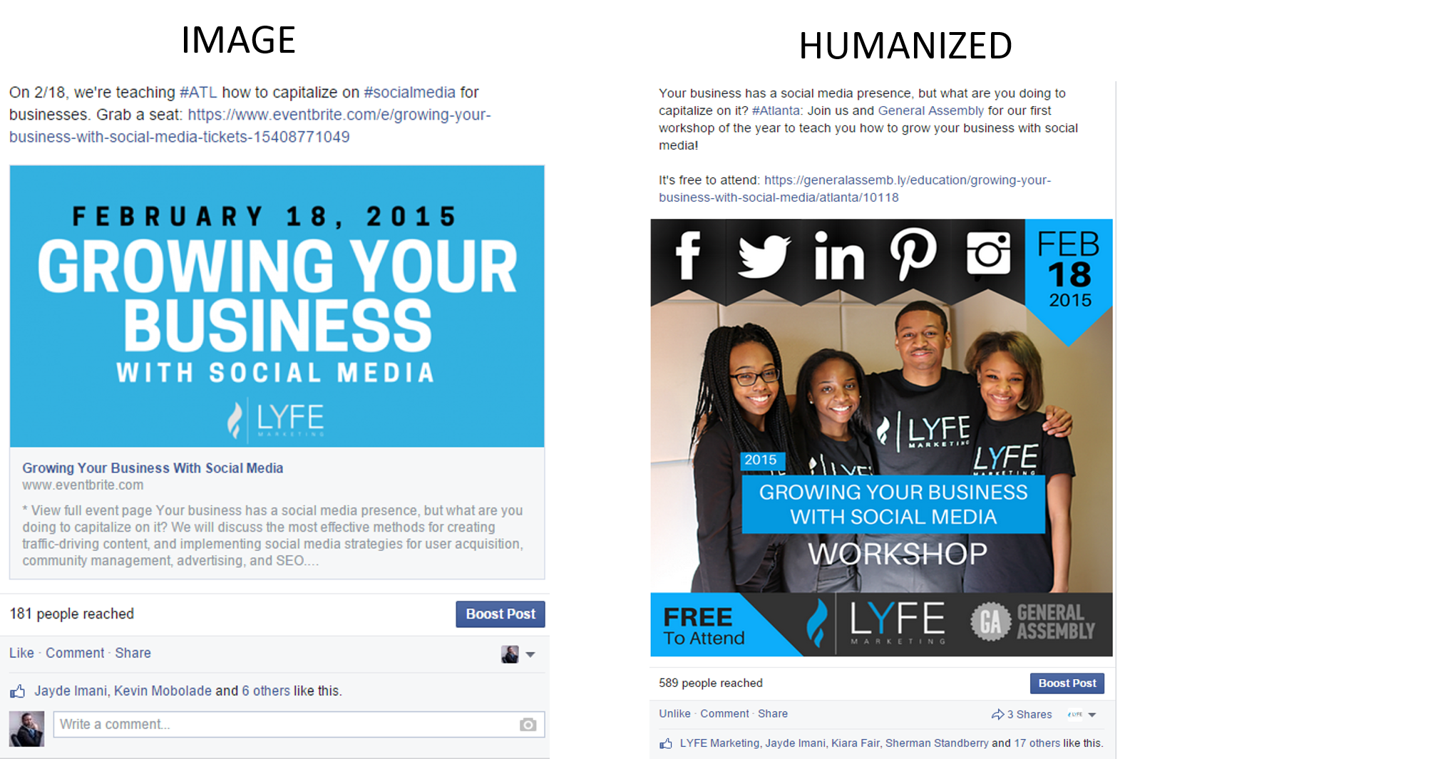 In the promotion of LYFE Marketing’s upcoming workshop “Growing Your Business with Social Media” we took two different promotional flyers to social media. The flyer which included our team members received an increase 38% engagement and 45% increase for conversions on sign ups.
